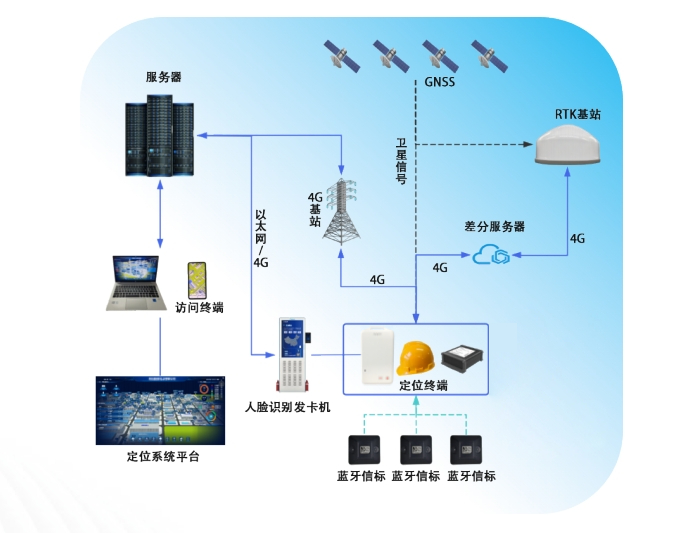為了克服傳統定位系統的局限性,新銳科創自主研發推出北斗RTK+藍牙+4G融合定位系統。該系統集成了北斗衛星導航系統的高精度定位能力、藍牙技術的短距離通信優勢以及4G網絡的實時數據傳輸特性,實現了露天煤礦全區域、高精度、實時性的人員定位。